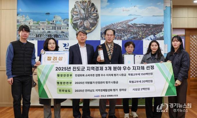 진도군은 ‘민생회복 소비쿠폰 집행 우수 지방자치단체 평가’를 비롯한 지역경제 3개 분야 평가에서 우수 기관으로 선정되며, 특별교부세 1억 7천만 원과 시상금 2백만 원을 확보했다.