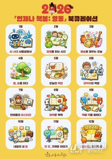 [경기뉴스원/경기뉴스1] | 영동교육도서관은 2026년 1월부터 12월까지 '언제나 책봄: 영동' 북큐레이션을 운영한다. 매월 주제에 맞는 대상별 추천도서 32권을 전시하여 도서관 이용자에게 다양한 독서 경험을 제공하기 위함이다.