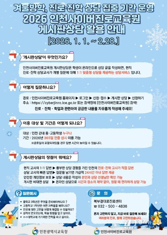 [경기뉴스원/경기뉴스1] | 인천광역시교육청은 겨울방학을 맞아 중·고등학생들이 새 학년 준비 과정에서 진로와 학업에 대한 고민을 해소할 수 있도록, 인천사이버진로교육원 ‘겨울방학 상담 집중 기간’을 1월부터 2월까지 운영한다.
