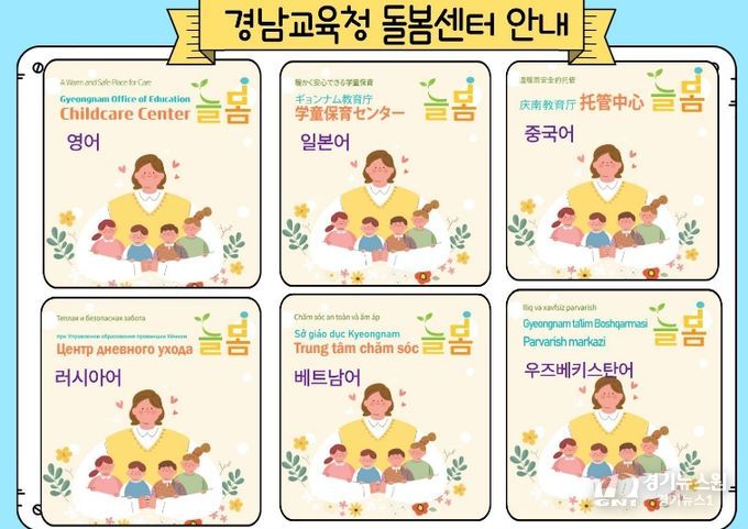 [경기뉴스원/경기뉴스1] | 경상남도교육청은 다문화 가정과 외국인 학부모가 돌봄 서비스를 쉽게 이해할 수 있도록 경남교육청 돌봄센터 ‘늘봄’ 안내자료를 6개 국어로 제작해 배포했다. 지원 언어는 영어, 일본어, 중국어, 베트남어, 러시아어, 우즈베키스탄어이다.