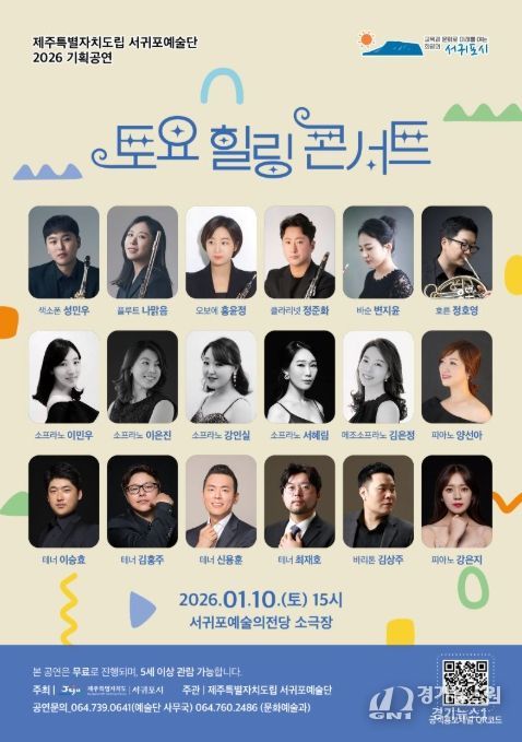 [경기뉴스원/경기뉴스1] | 서귀포시는 10일 15시 서귀포예술의전당 소극장에서 도립서귀포예술단의 기획 공연 ‘2026 즐거운 주말 ! 토요 힐링 콘서트’를 개최한다.