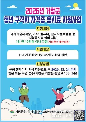 [경기뉴스원/경기뉴스1] | 거창군은 미취업 청년의 취업 역량 강화와 경제적 부담 완화를 위해 각종 자격증 시험 응시료를 지원한다.