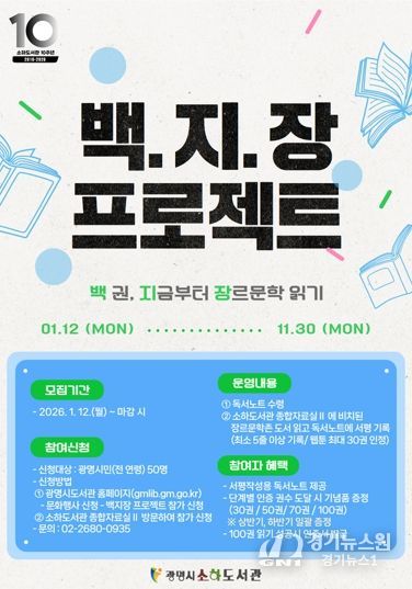 [경기뉴스원/경기뉴스1] | 광명시 소하도서관은 오는 12일부터 장르문학 도서 100권 읽기 챌린지인 ‘백.지.장 프로젝트’ 참여자를 모집한다.