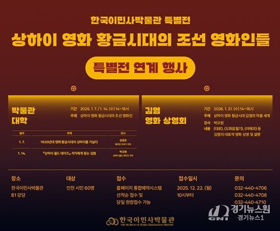 [경기뉴스원/경기뉴스1] | 인천광역시 시립박물관 분관 한국이민사박물관은 특별전 〈상하이 영화 황금시대의 조선 영화인들〉과 연계해 『상하이 올드 데이즈』의 저자 박규원 작가를 초청한 특강을 개최한다.