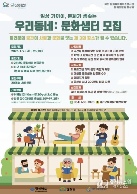 [경기뉴스원/경기뉴스1] | 예천군과 (재)예천문화관광재단은 ‘문화특화지역 조성사업’의 일환으로 문화생활권 조성을 위한 ‘우리동네:문화샘터’ 2기 참여자를 9일부터 25일까지 모집한다.