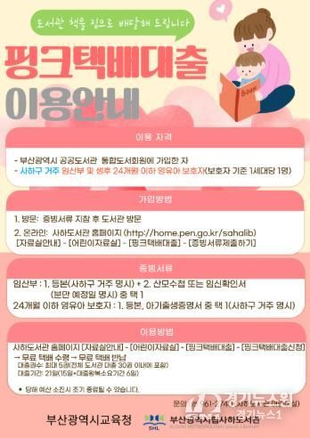 [경기뉴스원/경기뉴스1] | 부산광역시립사하도서관은 사하구에 거주하는 임산부 및 생후 24개월 이하 영유아 보호자를 대상으로, 온라인 신청 시 도서를 무료 택배로 대출·반납할 수 있는 ‘핑크택배대출서비스’를 운영한다.