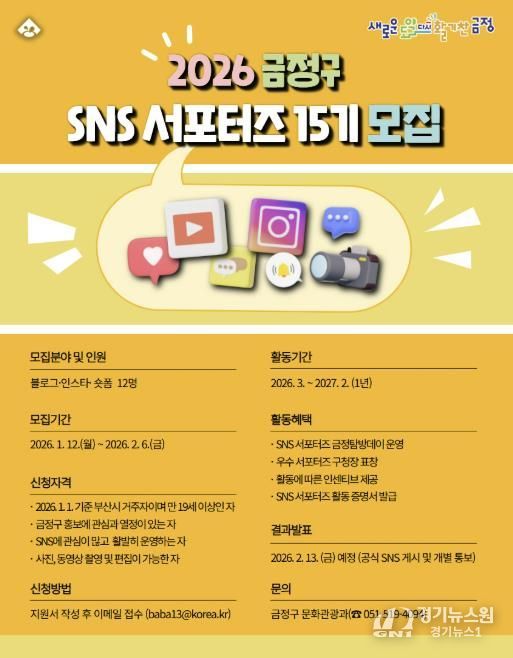 [경기뉴스원/경기뉴스1] | 부산시 금정구가 구민들과의 온라인 소통 확대를 위한 SNS 서포터즈를 모집한다.