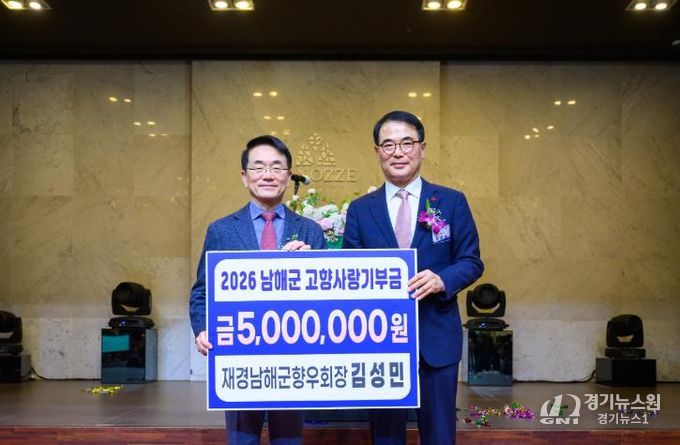 [경기뉴스원/경기뉴스1] | 재경남해군향우회 김성민 회장이 지난 6일 서울에서 열린 ‘2026년 재경향우회 신년하례회’에서 남해군의 발전을 위해 고향사랑기부금 500만 원을 기탁했다.