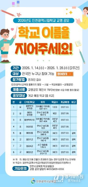 [경기뉴스원/경기뉴스1] | 인천광역시교육청은 1월 14일부터 28일까지 2주간 신설학교 8교의 명칭을 공모한다.