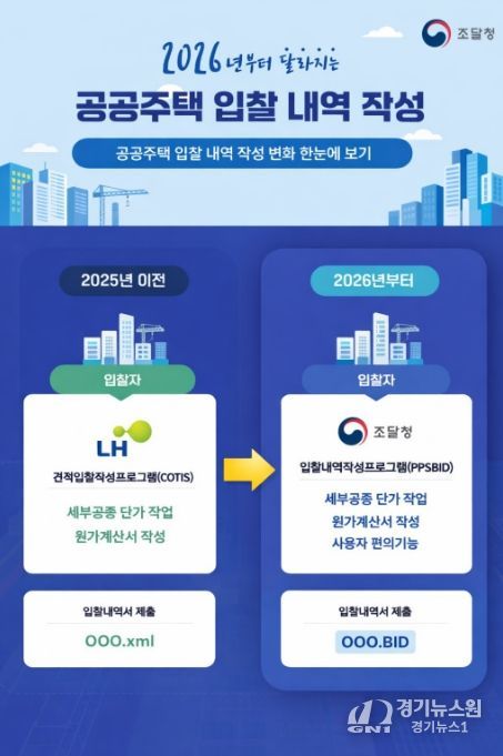 [경기뉴스원/경기뉴스1] | 조달청은 2026년부터 LH 공공주택 입찰 시 내역서를 ‘조달청 입찰내역작성프로그램’을 이용하여 작성해야 한다고 밝혔다.