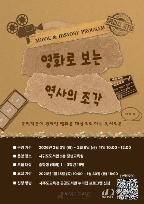 [경기뉴스원/경기뉴스1] | 제주도교육청 서귀포도서관은 2월 3일부터 6일까지 영화와 역사를 매개로 청소년들의 복합적 사고력을 배양하고 독서 흥미를 높이기 위해 ‘영화로 보는 역사의 조각’ 프로그램을 운영한다.