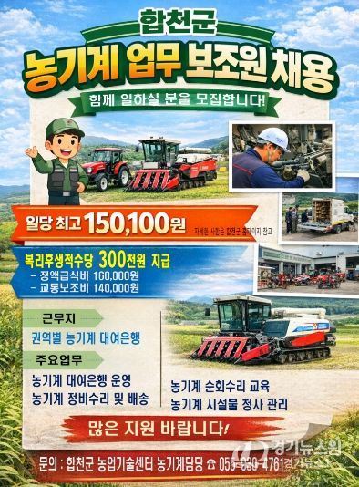 [경기뉴스원/경기뉴스1] | 합천군은 농기계대여은행 운영체계를 강화하고 농업인 영농 편의를 높이기 위해 2026년 농기계 업무보조원 기간제근로자 9명을 채용한다고 14일 밝혔다.