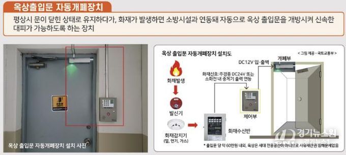 옥상 출입문 비상 자동개폐장치는 평소 문이 닫힌 상태에서 화재가 발생했을 경우 소방시설과 연동돼 자동으로 옥상 출입문을 개방해 신속한 대피를 돕는다.