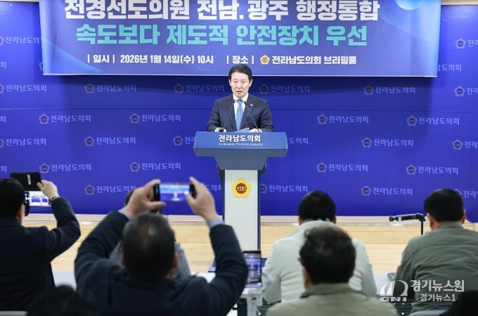 [경기뉴스원/경기뉴스1] | 전라남도의회 전경선 의원(더불어민주당·목포5)은 14일, 전라남도의회 브리핑룸에서 기자회견을 열고, 전남-광주 행정통합과 관련해 “통합의 큰 방향과 대의에는 동의하며 적극 지지하지만, 속도전 통합이 아닌 제도적 안전장치가 우선돼야 한다”고 밝혔다.