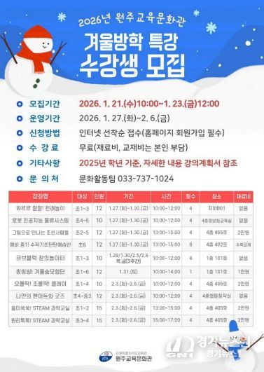 [경기뉴스원/경기뉴스1] | 원주교육문화관(관장 용석태)은 1월 21일부터 23일까지 관내 초·중학생을 대상으로 겨울방학 특강 수강생을 모집한다.