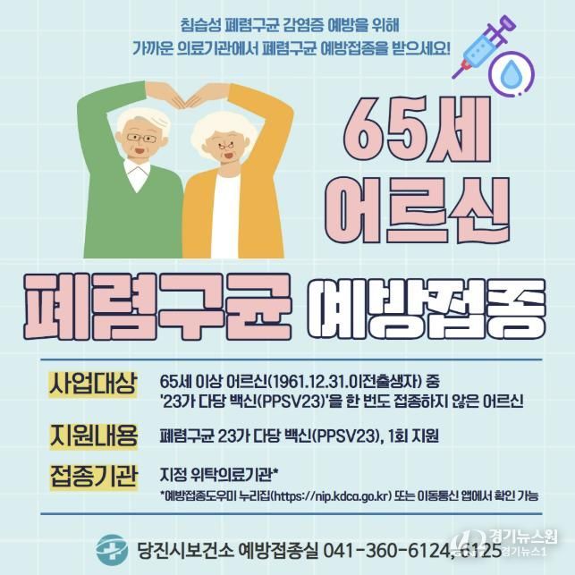[경기뉴스원/경기뉴스1] | 당진시는 관내 65세 이상(1961.12.31. 이전 출생자) 중 23가 다당질 폐렴구균 백신(PPSV23)을 한 번도 접종하지 않은 어르신을 대상으로 폐렴구균 무료 예방접종을 실시한다고 15일 밝혔다.