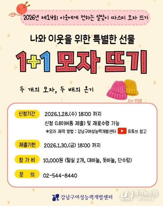 [경기뉴스원/경기뉴스1] | 꿈이 모이는 도시, 미래를 그리는 강남구가 주민들이 직접 만든 털모자를 어르신과 장애인 등 소외계층에게 전달하는 ‘따스미 모자 뜨기’ 참가자를 1월 28일까지 모집한다.