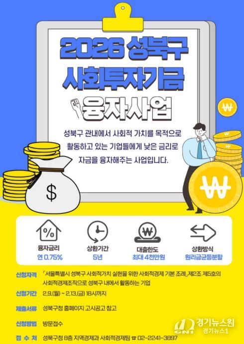 [경기뉴스원/경기뉴스1] | 서울 성북구가 ‘2026년 상반기 사회투자기금 융자 지원 사업’을 실시한다. 경제적 어려움을 겪는 관내 사회적경제 조직의 안정적인 운영을 돕기 위해서다.