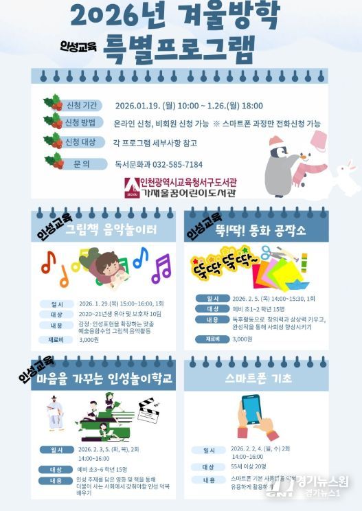 [경기뉴스원/경기뉴스1] | 인천광역시교육청서구도서관은 ‘2026년 겨울방학 특별프로그램’ 학습자를 19일 오전 10시부터 선착순으로 모집한다.
