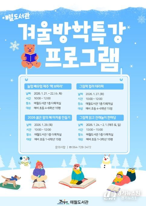 [경기뉴스원/경기뉴스1] | 제주시 애월도서관은 겨울방학을 맞아 어린이들이 책과 놀이, 체험 활동을 통해 즐겁게 배우고 독서에 대한 흥미와 창의력을 키울 수 있도록 ‘2026 애월도서관 겨울방학특강 프로그램’을 운영한다.