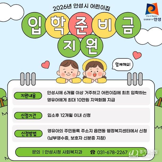 [경기뉴스원/경기뉴스1] | 안성시는 2026년부터 어린이집 입학준비금 지원사업을 시행한다고 밝혔다.