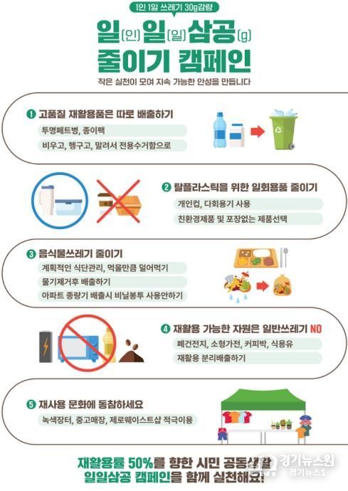 [경기뉴스원/경기뉴스1] | 안성시는 시민의 자발적인 실천을 통해 재활용률을 높이고 생활쓰레기 발생량을 줄이기 위한 ‘1인 1일 쓰레기 30그램 줄이기(일일삼공) 캠페인’을 적극 추진하고 있다고 밝혔다.