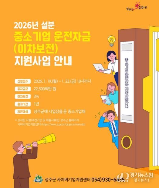 [경기뉴스원/경기뉴스1] | 성주군은 설 명절을 앞두고 관내 중소기업의 자금 부담 완화를 위해 2026년도 중소기업 운전자금(이차보전) 설 명절분을 225억원 규모로 지원한다.