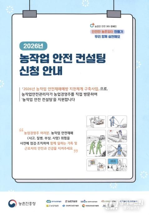 [경기뉴스원/경기뉴스1] | 안동시는 농업 분야 중대재해 예방과 안전한 농작업 환경 조성을 위해 '2026년 농작업 안전재해예방 지원체계 구축사업'의 일환으로 ‘농작업 안전보건관리 컨설팅’ 참여농가를 모집한다고 1월 16일(금) 밝혔다.