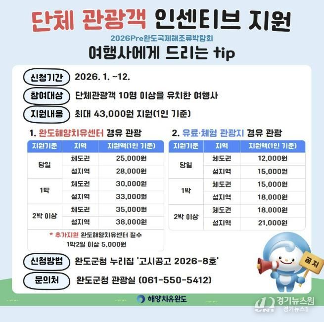 [경기뉴스원/경기뉴스1] | 완도군은 관광객 유치를 통한 관광산업 발전과 지역 경제 활성화를 위해 단체 관광객을 유치하는 여행사에게 인센티브를 지원한다.