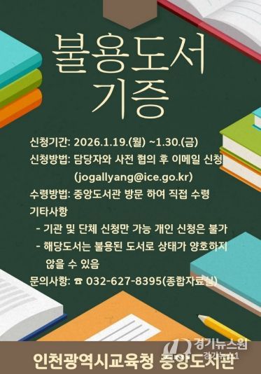 [경기뉴스원/경기뉴스1] | 인천광역시교육청중앙도서관은 지역사회 내 도서 나눔 문화를 확산하고 지식 자원의 선순환을 실천하기 위해 ‘불용도서 기관 나눔’ 사업을 운영한다.