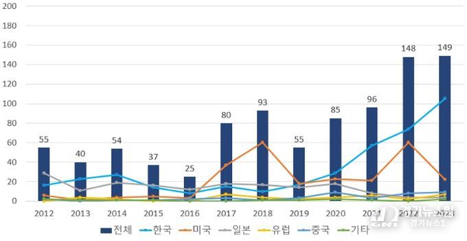 [경기뉴스원/경기뉴스1] | 지식재산처가 최근 12년(2012년~2023년) 선진 5개 지식재산기관(IP5: 한국, 미국, 중국, 유럽연합, 일본)에 출원된 강유전체 소자 분야 특허를 분석한 결과, 한국이 출원량 43.1%(395건)로 1위를 차지했다. 연평균 증가율도 한국이 18.7%로 가장 높아 한국이 출원량과 증가율 모두 1위를 차지하며 차세대 메모리 기술을 선도하고 있는 것으로 나타났다.