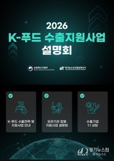 [경기뉴스원/경기뉴스1] | 농림축산식품부는 K-푸드의 글로벌 진출 확대를 위해 전년보다 900억원 증가한 7,070억원 규모의 2026년 K-푸드 수출지원사업 설명회를 1월 23일 서울 과학기술컨벤션센터에서 개최한다고 밝혔다.
