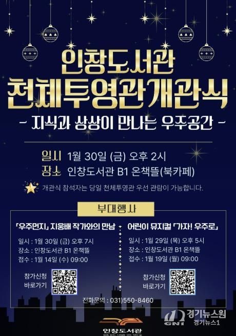 [경기뉴스원/경기뉴스1] | 구리시는 오는 1월 30일 오후 2시 인창도서관 지하 북카페에서 주요 내빈이 참석한 가운데 4층 야외에 조성된 인창도서관 천체투영관 개관식을 개최한다고 밝혔다.