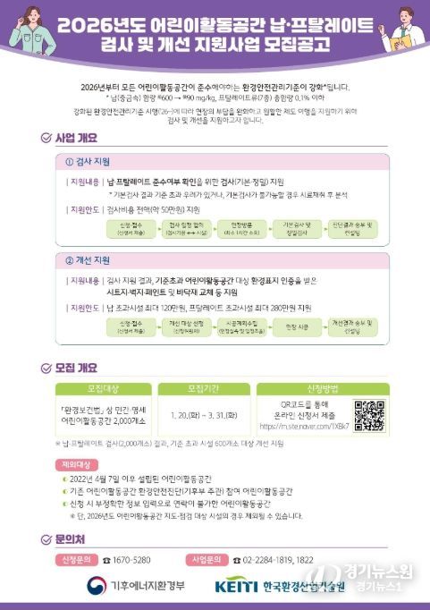[경기뉴스원/경기뉴스1] | 기후에너지환경부와 한국환경산업기술원은 어린이 활동공간에 새롭게 적용되는 환경안전관리기준에 따라 ‘납’과 ‘프탈레이트’에 대한 검사를 지원하고, 기준을 초과한 시설에 대해서는 개선 지원을 추진한다고 밝혔다.