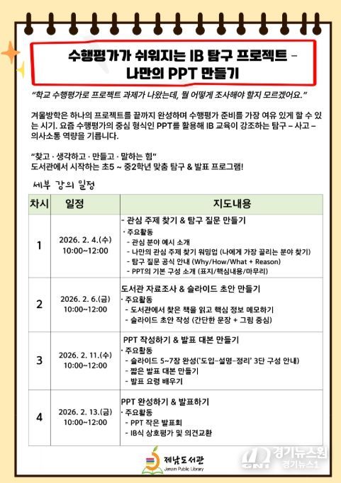 제남도서관 관계자는 “이번 프로그램을 통해 학생들이 스스로 주제를 정하고 탐구하는 경험을 쌓음으로써 자기주도적 학습 역량을 기르고 학교 수행평가와 발표 수업에 대한 자신감을 높이는 계기가 되길 바란다”고 말했다.