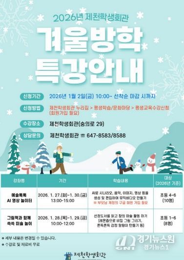 [경기뉴스원/경기뉴스1] | 제천학생회관은 겨울방학을 맞아 인공지능(AI)을 활용한 디지털 창작 활동 및 그림책을 연계한 미술 놀이 프로그램 등 창의·예술 체험 중심의 특별 프로그램을 운영한다.
