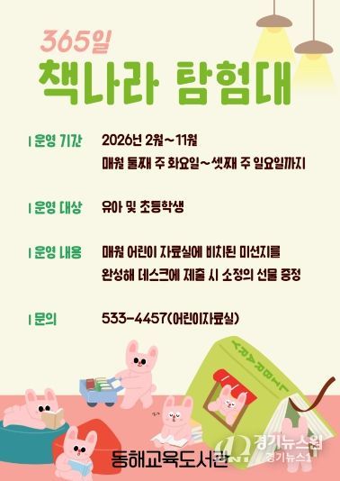 [경기뉴스원/경기뉴스1] | 동해교육도서관(관장 안은희)은 어린이들의 독서 흥미를 높이고 도서관 방문을 활성화하기 위해 어린이 독서활동 프로그램 ‘365일 책나라 탐험대’를 운영한다고 밝혔다.