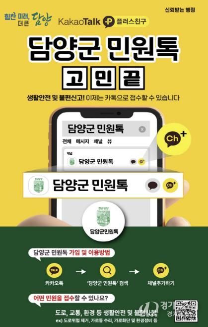 [경기뉴스원/경기뉴스1] | 담양군이 군민과의 소통을 강화하고 생활 속 불편과 안전 문제를 신속하게 해결하기 위해 카카오톡 채널 ‘담양군 민원톡’ 활성화에 나섰다.