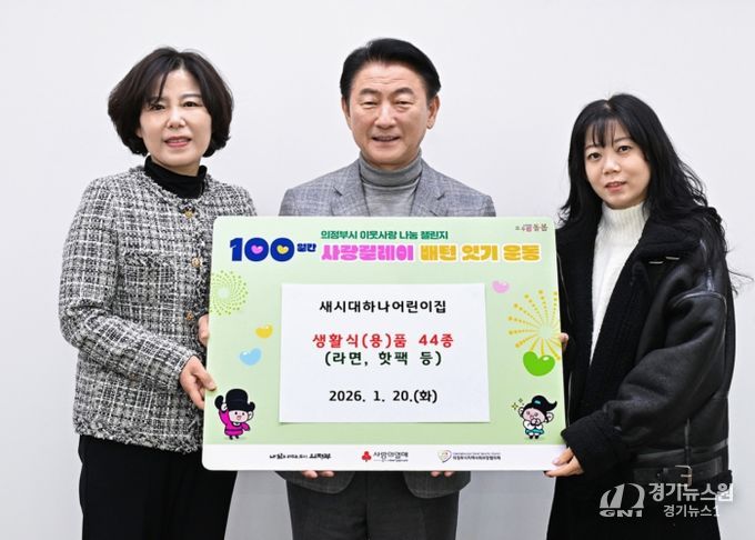 [경기뉴스원/경기뉴스1] | 의정부시는 1월 20일 새시대하나어린이집이 ‘100일간 사랑릴레이 배턴 잇기’에 동참해 관내 저소득층을 위한 생활식(용)품 44종(라면, 핫팩 등)을 기부했다고 밝혔다.