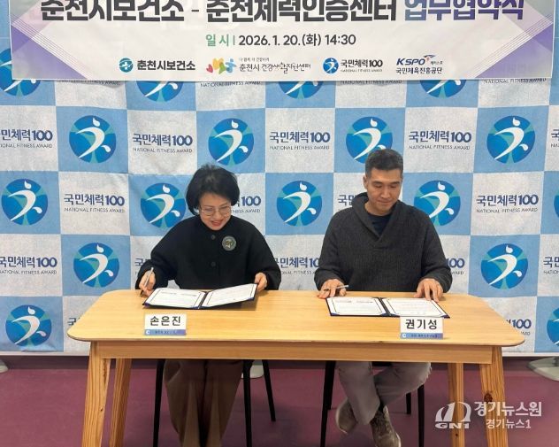 [경기뉴스원/경기뉴스1] | 춘천시보건소와 춘천체력인증센터(센터장 권기성)가 20일 강원대 백령스포츠센터에서 춘천시민의 건강증진 활동과 체력수준 향상 및 상호 교류⬝협력 강화를 위한 업무협약을 체결했다.