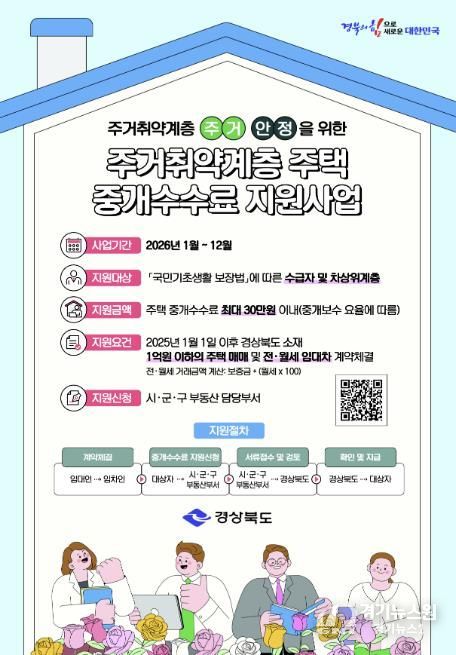 [경기뉴스원/경기뉴스1] | 상주시는 주거 취약계층의 경제적 부담을 완화하고 안정적인 주거환경 조성을 위하여 2026년 1월부터 “주거 취약계층 주택 중개보수 지원사업”을 시행한다.