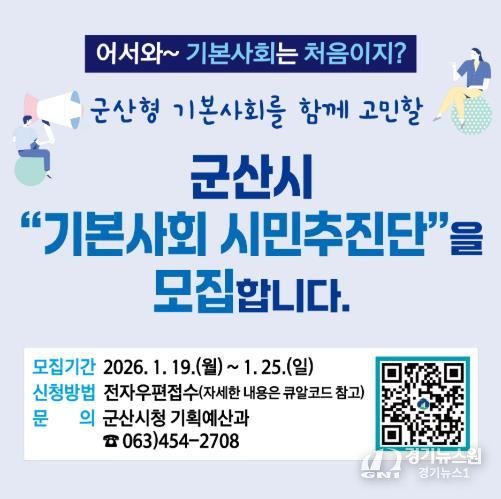 [경기뉴스원/경기뉴스1] | 군산시가 오는 25일까지 ‘기본사회’ 밑그림을 함께 그려 나갈 ‘군산시 기본사회 시민추진단’을 공개 모집한다.