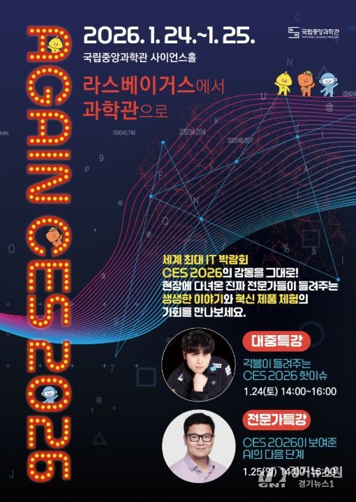 [경기뉴스원/경기뉴스1] | 미래의 꿈을 만드는 과학기술 문화 이음터(플랫폼) 과학기술정보통신부 국립중앙과학관은 1월 24일부터 1월 25일까지 이틀간 국립중앙과학관 사이언스 홀에서 세계 최대 정보 기술(IT) 박람회인 2026 미국 가전 전시회(CES 2026)를 되짚어 보는 행사를 개최한다.