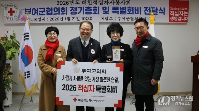 [경기뉴스원/경기뉴스1] | 부여군의회는 21일 대한적십자사봉사회 부여군협의회 정기총회에서 2026년도 대한적십자사 특별회비 전달식을 가졌다.