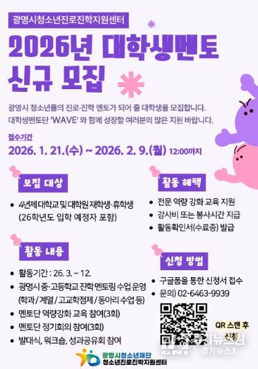 [경기뉴스원/경기뉴스1] | 광명시청소년재단 청소년진로진학지원센터는 관내 중·고등학교 청소년 대상 학과 멘토링 운영을 위해 ‘2026년 대학생 멘토단(wave)’을 모집한다고 밝혔다.