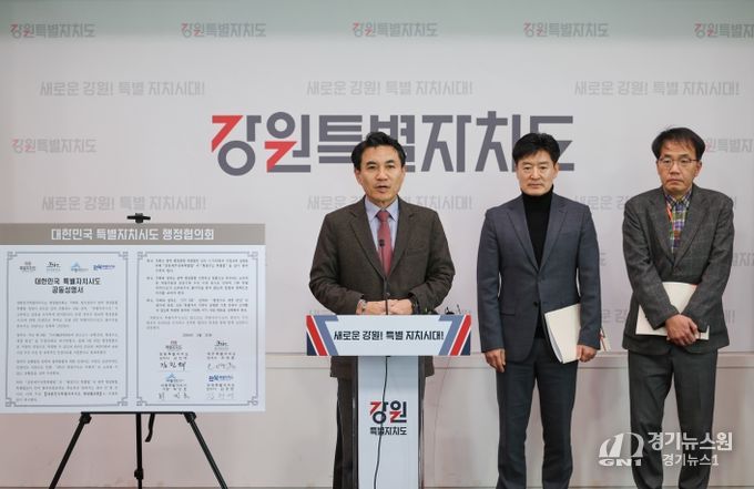 [경기뉴스원/경기뉴스1] | 강원, 제주, 세종, 전북으로 구성된 ‘대한민국특별자치시도 행정협의회’(대표회장 : 김진태 강원특별자치도지사)는 1월 21일 4개 특별자치시‧도의 특별법안 조속한 통과와 광역 행정통합 인센티브 부여에 따른 역차별 우려를 담은 공동성명서를 발표했다.