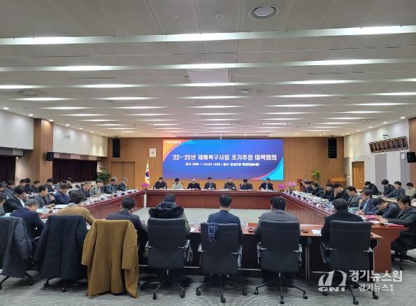 도는 23일 도청 대회의실에서 신일호 안전기획관 주재로, 도 관련 부서 및 시군 과장들이 참석한 가운데 ‘재해복구사업 조기 추진 대책회의’를 개최했다.