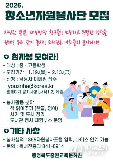 [경기뉴스원/경기뉴스1] | 충청북도교육청 직속기관 중원교육문화원은 2월 13일까지 2026년도 '어울림자원봉사단'을 모집한다.