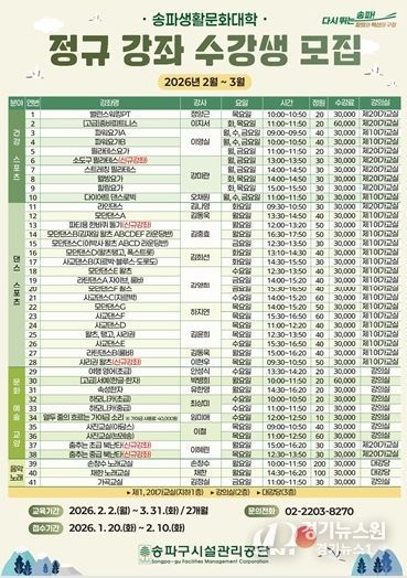 수강 접수 기간은 기존 수강생은 1월 27일까지, 신규 수강생은 1월 29일부터 2월 3일까지 순차 진행된다. 신청은 송파구시설관리공단 홈페이지 온라인 접수 또는 송파문화예술회관 1층 생활문화대학 사무실 방문을 통해 가능하다.