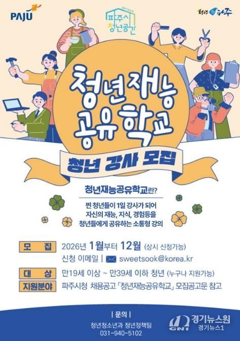[경기뉴스원/경기뉴스1] | 파주시는 2026년 1월부터 12월까지 청년을 대상으로 '청년재능공유학교' 청년강사를 연중 상시 모집한다.